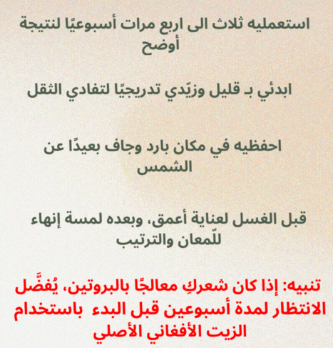 لنتائج فعّالة ومستدامة، يُنصَح بالالتزام باستخدام الزيت الأفغاني الأصلي لمدة لا تقل عن 5 أسابيع متواصلة. ومع الاستمرار تتعزّز انسيابية الخصلات وصقل الأطراف. النتائج قد تختلف حسب نوع الشعر وروتين العناية.
