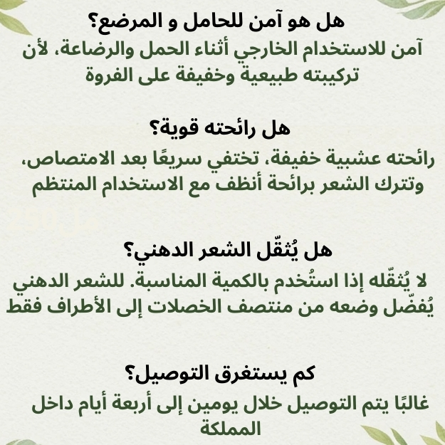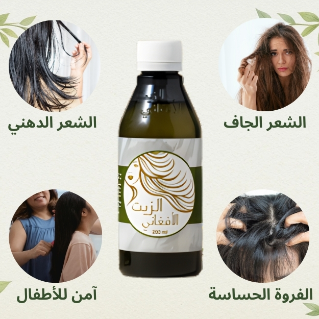 يساعد الزيت الأفغاني الأصلي على تهدئة فروة الرأس تدريجيًا وتقليل الإحساس بالحكّة والرائحة المزعجة مع الاستمرار، صالح لجميع أنواع الشعر وملائم للرجال و للأطفال فوق 4 سنوات