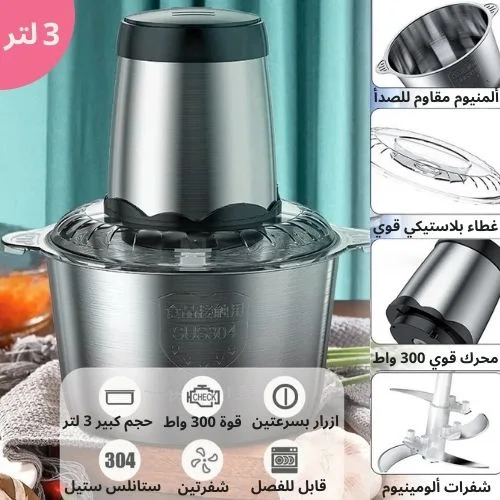 المفرمة الكهربائية تعمل على 300 فولت وبسعة 3 لتر ، وتأتي بوعاء من ستانلس ستيل مع غطاء شفاف، لتمنحك فرمًا سريعًا ومناسبًا لتحضير الحشوات والاستخدام اليومي.