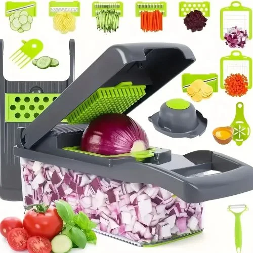القطّاعة متعددة الوظائف مصنوعة من بلاستيك متين مخصّص للاستخدام الغذائي مع شفرات من الفولاذ المقاوم للصدأ، وتضم حاوية تجميع شفافة وغطاء ضغط علوي لتقطيع أسرع وبفوضى أقل، مع واقي يد لزيادة الأمان