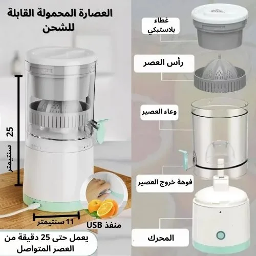 عصّارة الليمون القابلة للشحن بهيكل من بلاستيك متين مخصّص للاستخدام الغذائي مع أجزاء داخلية بتصميم لاسلكي سهل الحمل وتعمل حتى 25 دقيقة من العصر المتواصل